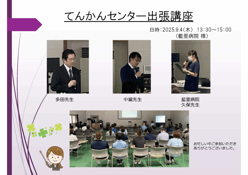 2025/10/20 Last updated : 2025/10/20 更新てんかん てんかんセンター出張講座(藍里病院) 2025年9月4日(木) 藍里病院様にご協力いただき、93名の方へ「てんかん出張講座」を開催させていただきました。当初の予定数より多くの方にご参加いただきました。お忙しい中ご参加いただきありがとうございました。 「 てんかん診療のキホンから最新治療まで ~多職種連携の必要性~ 」 徳島大学病院 脳神経外科・てんかんセンター 多田 恵曜 先生 「 てんかんと精神症状 」 徳島大学病院 精神科神経科・てんかんセンター 中瀧 理仁 先生